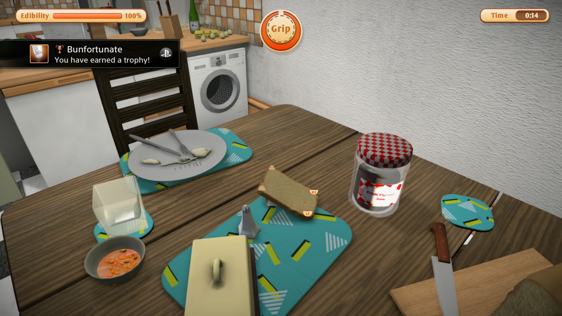 I am Bread is most fun when iIt’s just you, obstacles, and the environment without any limits other than your grip meter. Having the freedom to explore the environment and get your heat on is actually somewhat enjoyable. With that said the control system still kind of sucks and the physics system is a bust. I often found myself getting stuck in the weirdest places or not gripping onto various surfaces or items for seemingly no reason. The camera also acts wonky at times and the framerate stutters which blows my mind. The PS4 can display beauties like Killzone Shadow Fall and Metal Gear V: Phantom Pain in glorious 1080p but I am Bread’s engine is so poorly optimized that gameplay is sluggish and jerky. Hopefully this can be resolved in a game patch like it was for The Last Tinker: City of Colors which now runs smoothly.