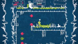 Anyway, if the though of severing and collecting body parts makes you want to pull an exorcist sans the demonic possession part then perhaps you\’ll take comfort in knowing that Severed\’s visuals aren\’t going for realism (in case you haven\’t noticed). That\’s what the Ninja Gaiden series is for. Instead, Drinkbox opted for their signature flat, simple aesthetic with bright and bold colors. When I look at all their past and present work I feel like this game is a hallmark of their art direction. The games bright and beautiful style juxtaposes the dark and grim story perfectly and really is never a bore to look at. The creature design is fun as well and really fits with the overall style, which is good because in between battles you’ll be doing some good ol’ dungeon crawling. As expected each dungeon holds multiple secrets and pathways, some of which you can’t access without finding specific items. It really is a nice break from battling and I found the balance of enemy encountered and exploration to be just right.